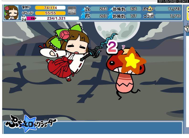 メイン画面はこんな感じ。巫女装束はニコPで買う課金アイテムです。巫女かわいいよ巫女。他にもナース服やナイトとかの装備もあります。武器も銃や剣などがあり、課金だけでなくぷちっとPというゲーム内通貨で買える装備もあります。