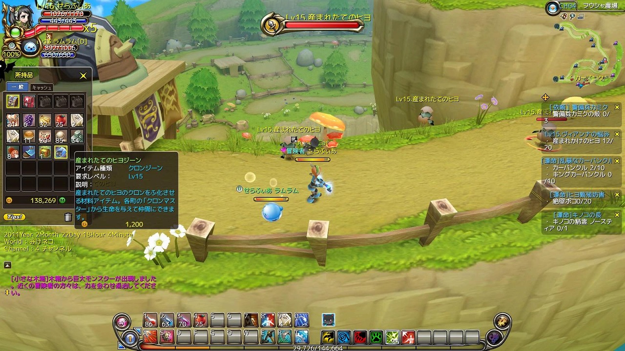 というわけで新MAPのクエストに挑戦。精霊の住処の次のMAP「フウシャ農場」です。あ、ちなみに精霊の住処のボス「ノースティア」は一度だけうまく誰もいなかったので戦ってみたら、フルボッコにされて涙目でした。もう少しLvあげてから挑戦しますorz。