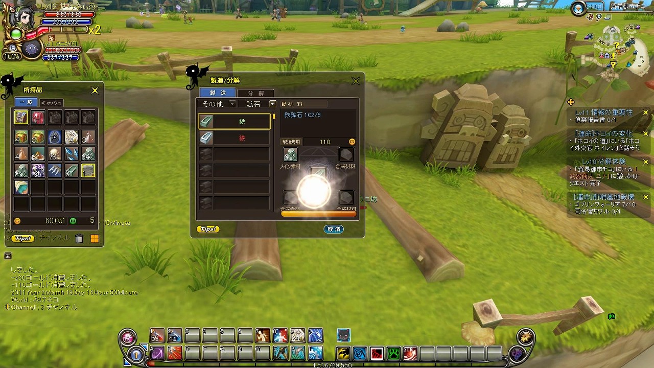 1周して戻ってきたチコでは転職クエストのほか、製造と分解のクエストが受けられます。採取やMOBからのドロップで手に入った材料アイテムで武器やポーション、その他材料アイテムなどを作れます。