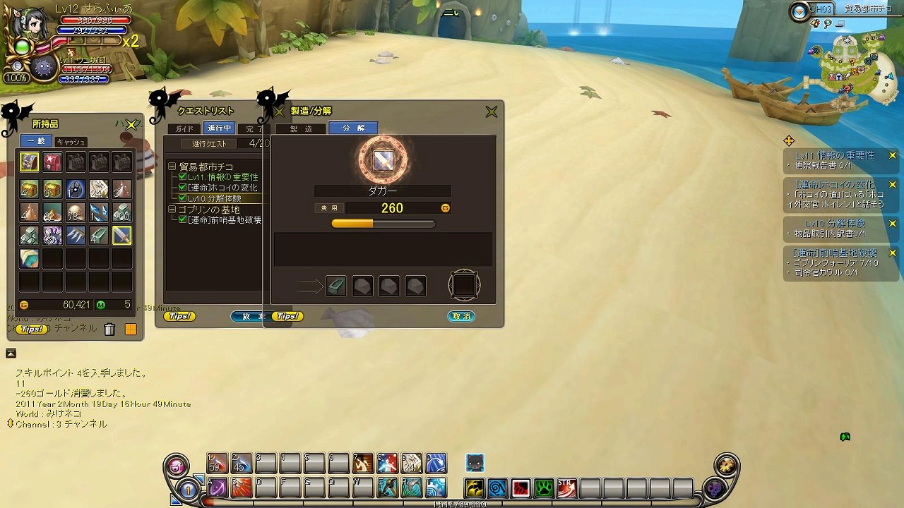 1周して戻ってきたチコでは転職クエストのほか、製造と分解のクエストが受けられます。採取やMOBからのドロップで手に入った材料アイテムで武器やポーション、その他材料アイテムなどを作れます。