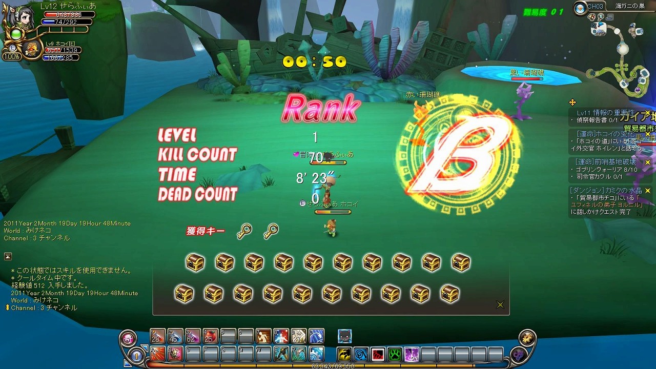 クロンがホコイですが、IDをクリアするとこういう感じでランクがつき、鍵の個数分宝箱を開けられる仕組みです。ただ、今のところインベントリが満杯なときにこれを開けようとすると当然手持ちにははいらず、再度入手することができなくなるので注意です。
