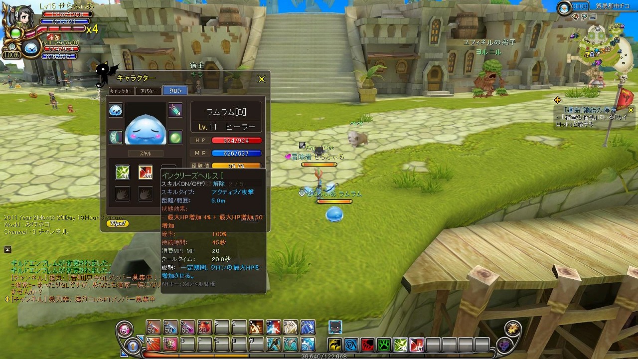 ・・・Lvが低いからなのか、ホコイがスキルを使ってMOBを集めてくれるんだけど一瞬にして死んでしまいます。ちなみにクロンは専用アイテムで復活できますが5回までで、5回になるとクロンマスターに復活回数をリセットしてもらわないといけません。当然失敗もあります。