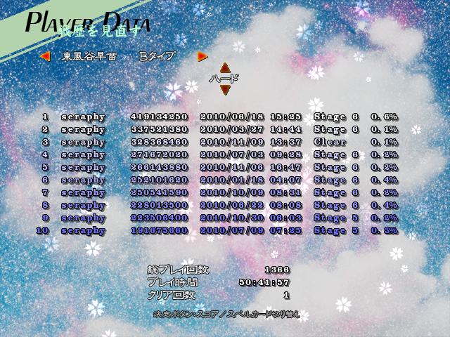 星蓮船も77時間くらいやってるのに今気付きましたが、大体普通の(6面+Exタイプ)東方シリーズはそれぞれ7,80時間やるので、おかしいところはなにもないですね。