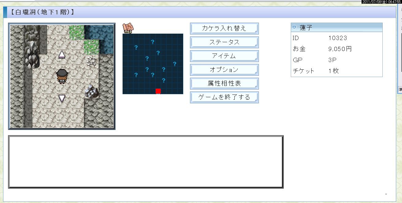 こんな感じで矢印をクリックして探索するだけのかんたん操作です。MAPの?の場所で誰かとバトルになったりアイテムが手に入ったりします。
